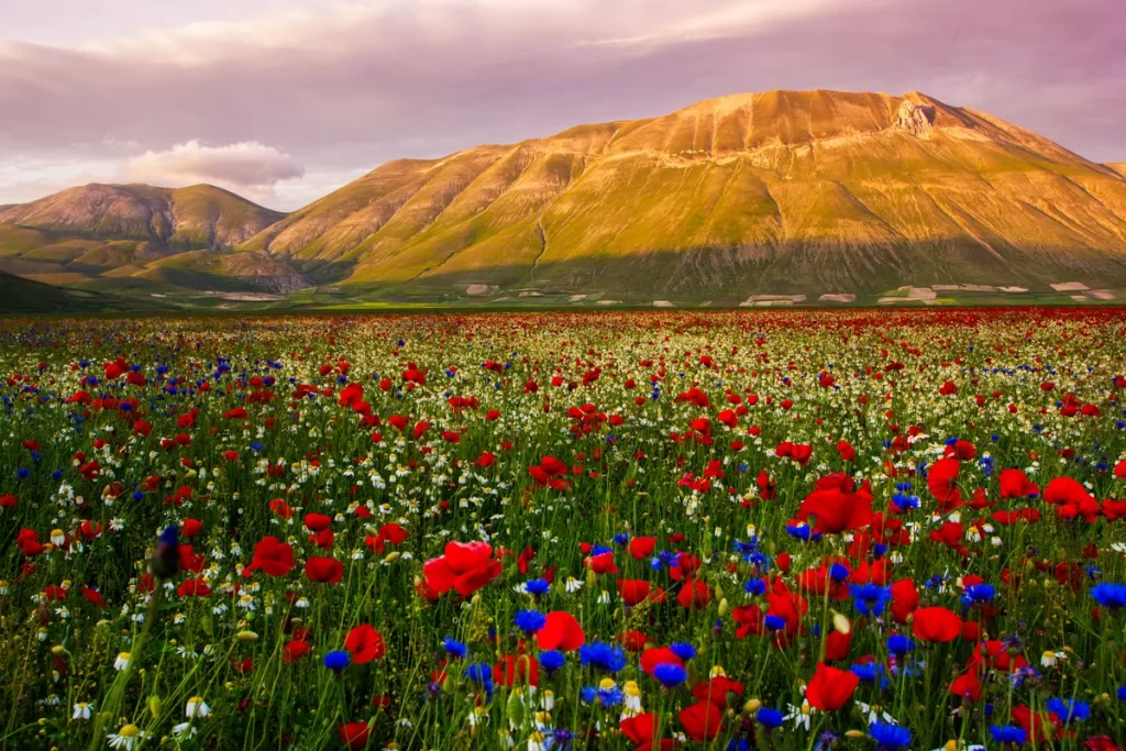 L’altopiano di Castelluccio di Norcia è bello da visitare tutto l’anno, ma a fine primavera cambia completamente volto. Nel periodo che va da maggio a metà luglio è un immenso tappeto verde con tanti fiori dai più svariati colori viola, azzurro, rosso, giallo regalando grandi emozioni e un panorama unico al mondo.